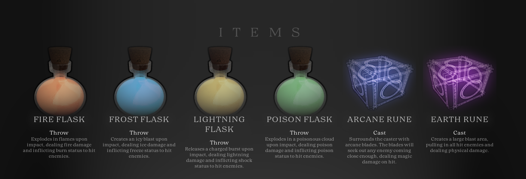 There are many items to expand your builds, including thrown flasks that explode with elemental damage, a variety of short to long duration buffs, and runes with powerful effects when cast. You'll always have one healing item, but you choose which type. Passive items are coming to give options for consistent bonuses, and maybe doubling down on character passives.