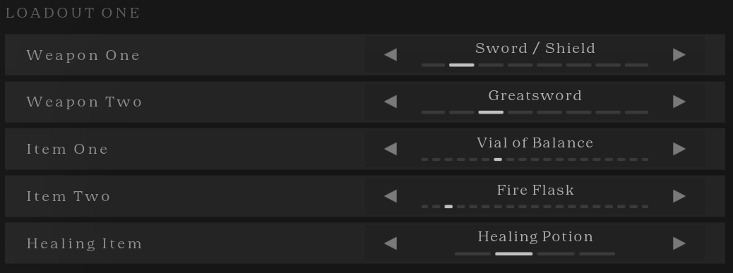 Loadouts give your build options. There are three loadout slots and each loadout contains two weapon slots, two item slots, and one healing slot. You can swap your active loadout whenever you respawn during a match, so you can build flexibly with a variety of loadouts like melee/ranged/caster or reinforce a playstyle with complementary variations.