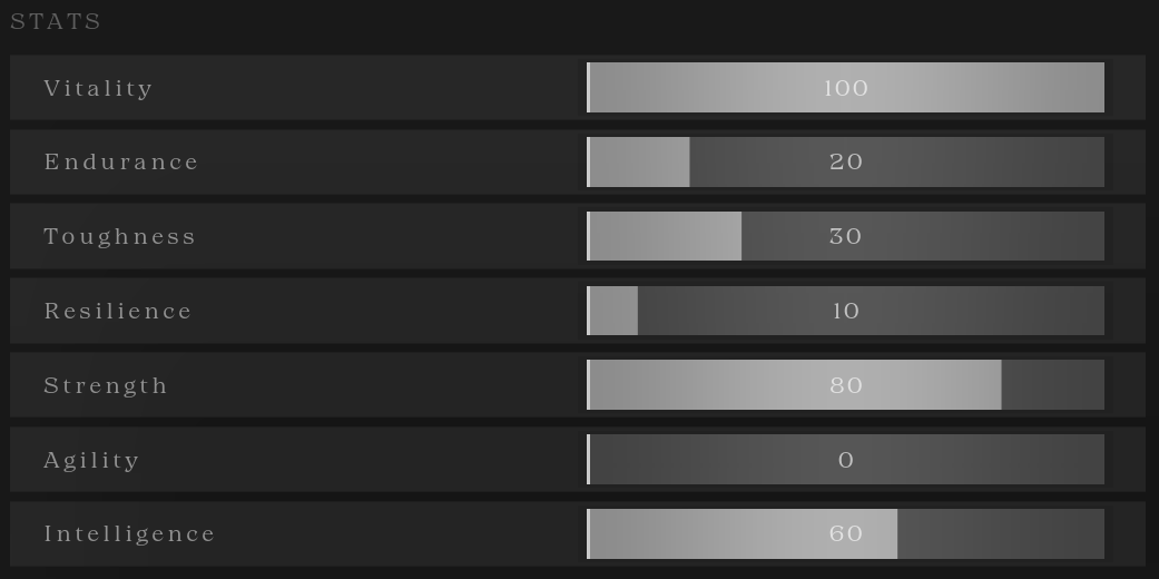 Stat points define how your build plays. Base attributes like health aren't too low however, so you won't just fall over if you forget to level your vitality. Stat investments have diminishing returns; spread your points evenly for efficiency or go all in on a crafted build. Strength, Agility, and Intelligence scale your damage output with different weapons. You can't change your character during a match, so choose carefully.
